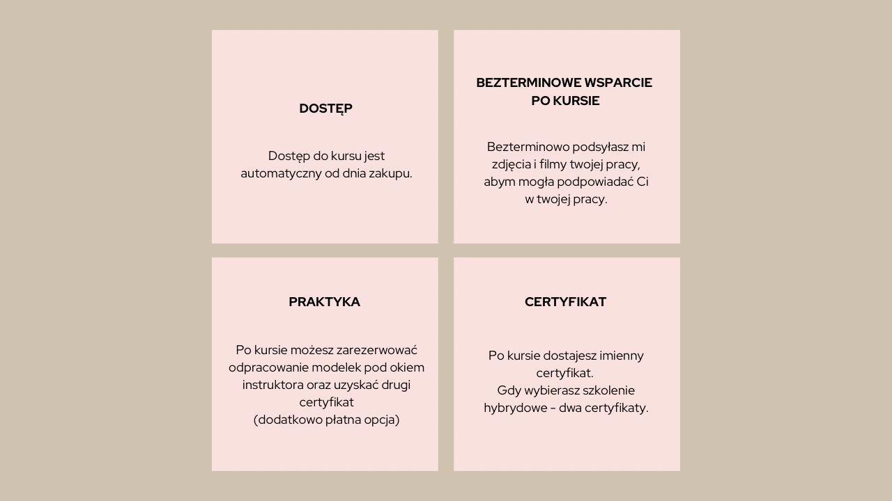 Aczkolwiek sam kurs on-line bardzo dobrze przygotowuje Cię do samodzielnego wykonywania zabiegu.